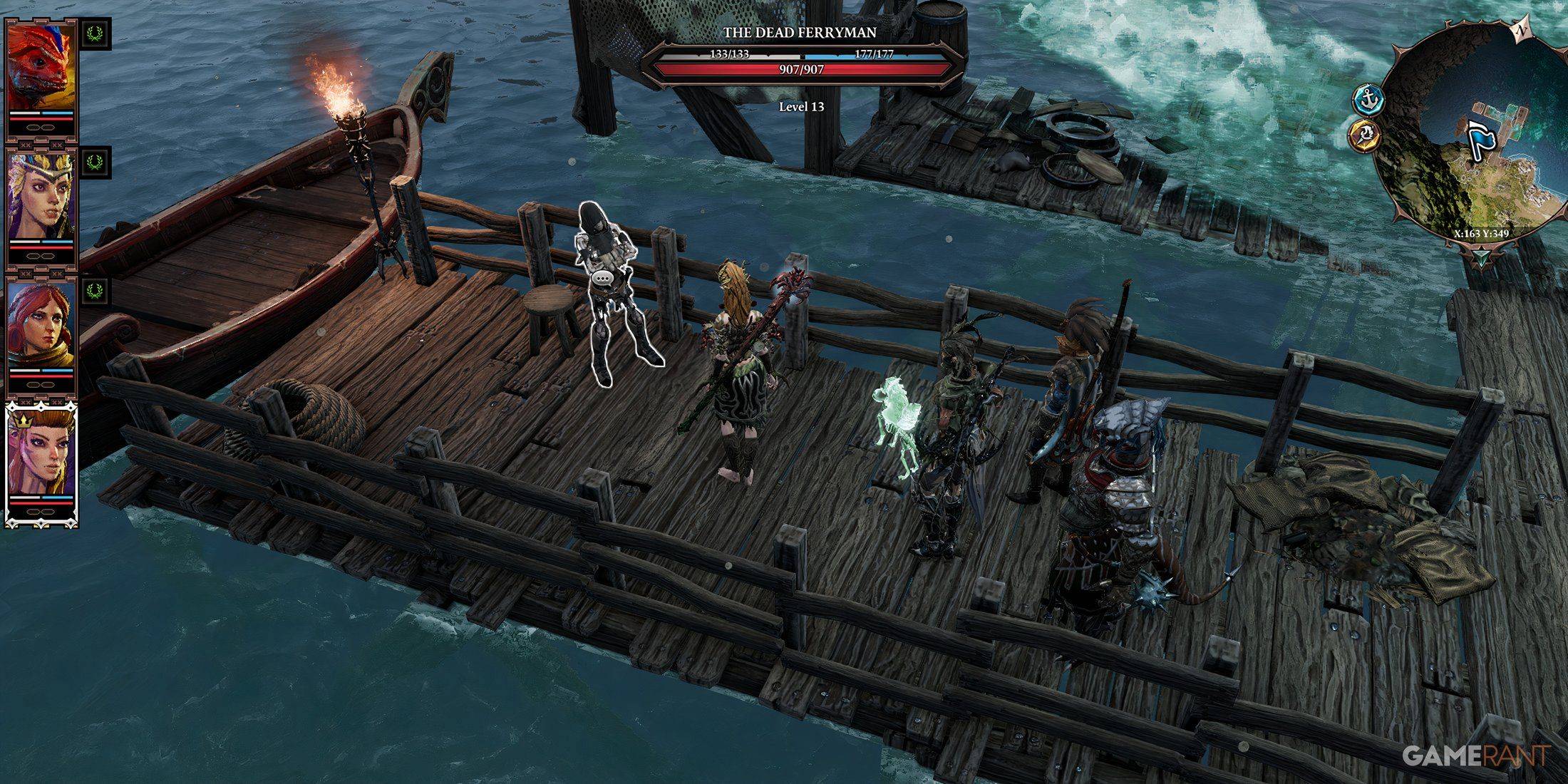 Seien Sie vorsichtig um den untoten Ferryman; Wenn er ihn angreift, kann man einen Todesfog -Zauber auslösen, der zum Sofortpartei -Wischen führt. Wenn Sie sich entscheiden, gegen ihn zu kämpfen, stellen Sie sicher, dass Sie vorher schnell gespart haben. Der Sieg über den Ferryman liefert ein beruhigendes kaltes Skillbook, einen gewöhnlichen Gürtel und 3.750 XP.