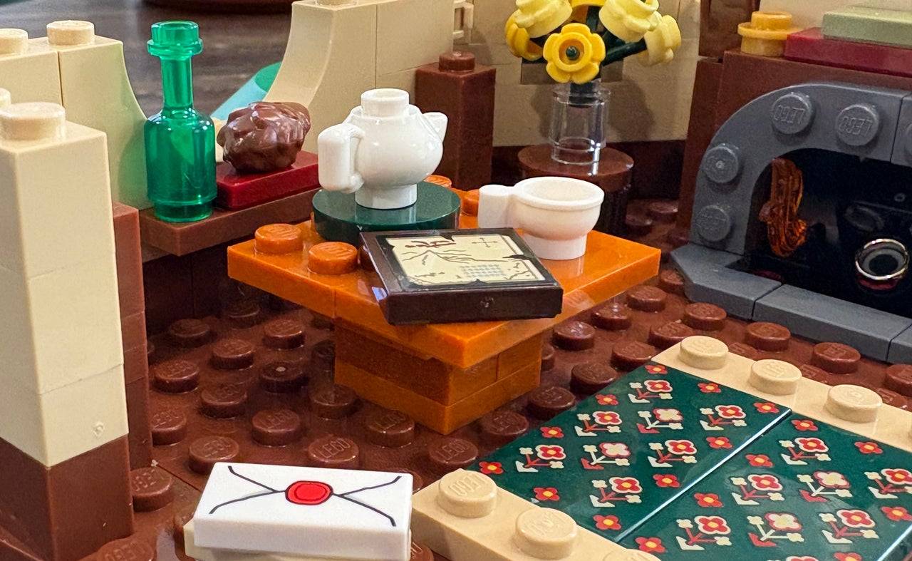 La maison de Bilbo n'est pas seulement un lieu de confort, mais aussi un référentiel de ses aventures passées. L'ensemble comprend le manteau Mithril et une carte bien usée de ses voyages, aux côtés d'autres artefacts comme une épée et un parasol. Une caractéristique notable est l'utilisation de la technique LEGO pour un élément mécanique qui vous permet de changer l'affichage du foyer entre une enveloppe carbonisée et la bague, faisant écho à une scène clé de la communion de l'anneau.