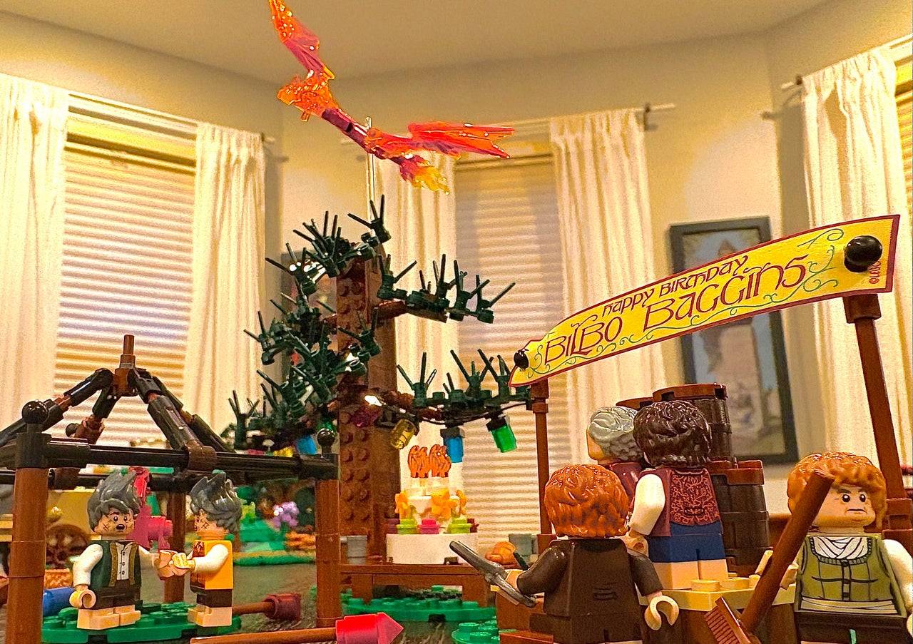 Des éléments supplémentaires améliorent le potentiel de narration de l'ensemble, notamment un gâteau d'anniversaire, un arbre de fête avec des lanternes, une tente, un feu d'artifice de dragon rouge, une voiture à cheval de Gandalf et un mécanisme de baril qui peut faire disparaître Bilbo comme il l'a fait lors de sa fête.