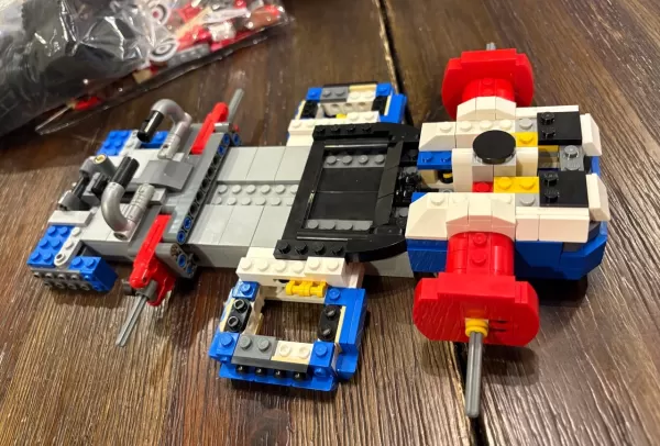 L'ensemble est soigneusement divisé en 17 sacs, offrant deux constructions distinctes. Le premier est le kart standard, où vous commencez par construire un maillage Technic LEGO, fixé avec des épingles et renforcé avec des briques, pour former le plancher du kart. Vous fixez ensuite méticuleusement les composants de la coque corporelle à l'aide de tiges et de pinces, y compris des roquettes / tuyaux d'échappement, des panneaux latéraux et un mécanisme de direction qui façonne également l'extérieur avant du kart.