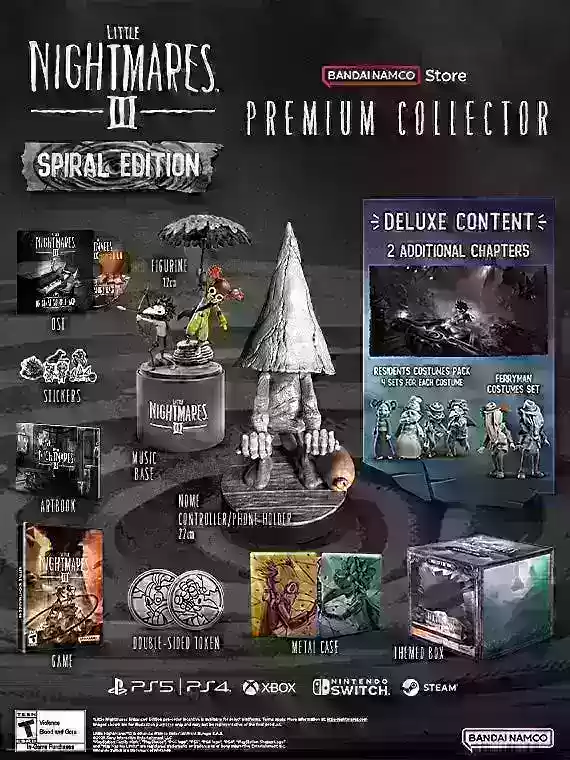 Все предзаказы включают набор костюмов Dark Six на всех платформах и ранний доступ к Little Nightmares Enhanced Edition. Secrets of The Spiral Expansion Pass будет содержать как минимум две дополнительные главы.