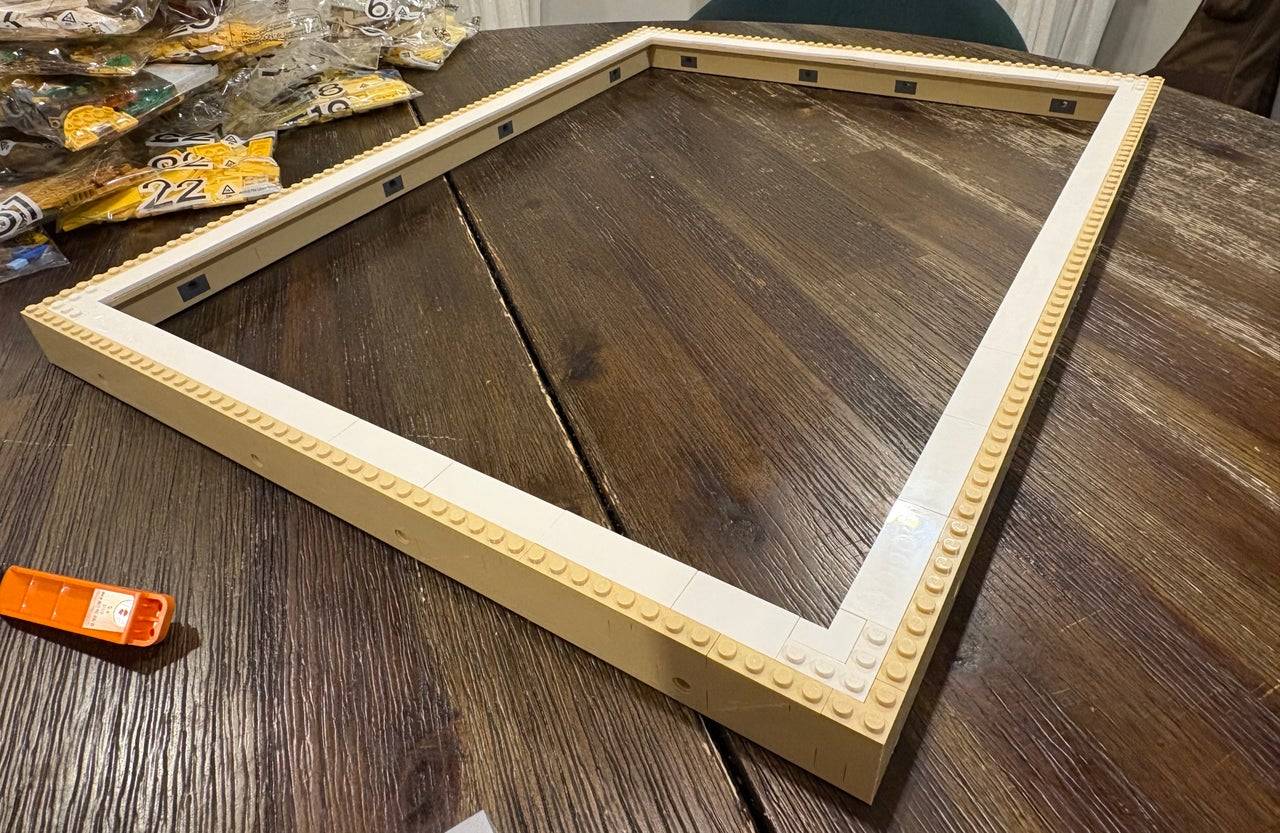 我发现拼搭过程非常实用。第一步是构建画框,我将其拼好并靠墙放置。第二步是拼搭画布及其上的画作。